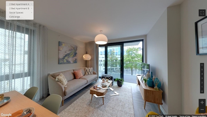 A more recent type of virtual viewing software in our arsenal, however, is one that maps out and photographs each individual apartment in the portfolio, along with 360 degree imaging. It acts as a more comprehensive representation of the space than a basic floorplan would. It’s this technology that has come into its own during this period of lockdown, allowing potential residents to see the very home that they will move into, without needing to visit or meet with a member of the leasing team. Every home is somewhat unique in a way that typical 2D floorplans struggle to illustrate. With this technology, the ‘virtual’ customer experience is transformed with accurate views from the balcony, a good indication of space for furniture and often overlooked information such as where plug sockets and radiators are.